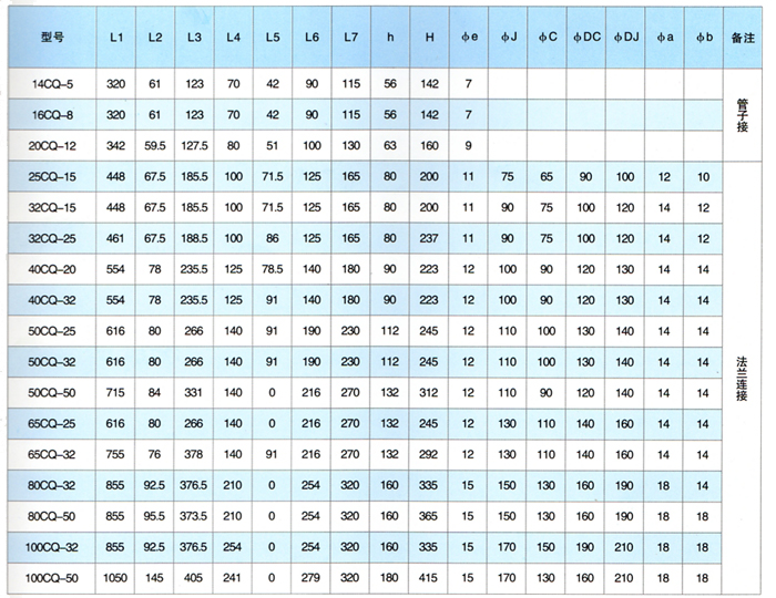 CQ型磁力驅(qū)動泵安裝尺寸圖: cq型不銹鋼磁力泵使用注意事項 1、因磁力泵軸承的冷卻和潤滑是靠被輸送的介質(zhì),所以禁止空動轉(zhuǎn),同時避免在工作中途停電后再啟動時 所造成時空載運轉(zhuǎn)。 2、被輸送介質(zhì)中,若含有固體顆粒,泵入口要加過濾網(wǎng):如含有鐵磁質(zhì)微粒,需加磁性過濾器。 3、泵在使用中環(huán)境溫度應小于40℃,電機溫升不得超過75℃。 4、被輸送的介質(zhì)及其溫度應在泵材允許范圍內(nèi)(詳見附表)。工程塑料泵的使用溫度<60℃,金屬泵的使用溫 度<100℃,輸送吸入壓力不大于0.2mpa,大工作壓力1.6mpa、密度不大于1600kg/m3,粒度不大于30×10- 6m2/s的不含硬顆粒和纖維的液體。 5、對于輸送液為易沉淀結(jié)晶的介質(zhì),使用后應及時清洗,排凈泵內(nèi)積液。 6、磁力泵運行500小時后,應拆檢軸承和端面動環(huán)的磨損情況,若軸承和軸套的間隙大于0.5~1mm,葉輪軸向 竄動1.5~2mm時,應 更換軸承和軸向動環(huán)。