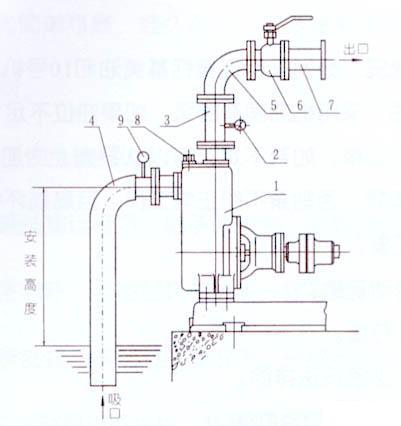 a. 吸入口的安裝高度不能超過5米,在條件許可時,吸入口的安裝高度應盡可能地低于水池低的儲水平面,并盡量縮短吸入管的長度,少裝彎頭,這樣有利于縮短自吸時間,提高自吸功能。