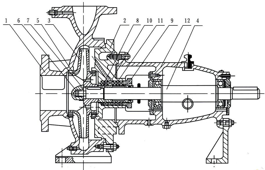 1 泵體 2 泵蓋 3 葉輪 4 軸 5 密封環(huán) 6 葉輪螺母 7 止動(dòng)墊圈 8 軸套 9 填料壓蓋 10 填料環(huán) 11 填料 12 懸架軸承部件