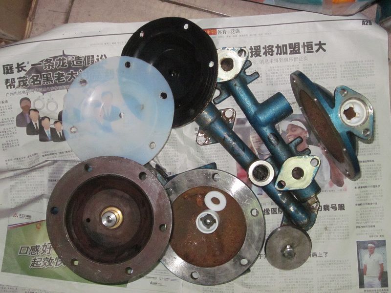 民泉碰到這樣的客戶,買了一臺隔膜泵,在正常壓力下不運作,然后就說是我們的產(chǎn)品有問題,然后從老遠(yuǎn)的地方坐車過來,要求換貨。結(jié)果我們的技術(shù)人員只用了2分鐘就把問題給解決了。這樣就大量浪費了客人的精力,民泉覺得不值。 其實有些隔膜泵的問題都是小問題,用戶自己都可以解決,又節(jié)省了金錢,又節(jié)約了時間。 現(xiàn)在民泉對氣動隔膜泵產(chǎn)品常見問題進(jìn)行簡答。 故障的確定: 將隔膜泵從管路中拆卸下來??諌簷C(jī)正常壓力試泵。 如果是配氣閥損壞,現(xiàn)象是這樣的:泵不工作,當(dāng)你按動配氣閥按鈕,泵也是不工作,那么初步判定是配氣閥損壞了。 如果是隔膜片損壞,現(xiàn)象是:隔膜泵工作,但是隔膜泵進(jìn)口和出口沒壓力或者壓力過小,那么就可以判斷是隔膜泵或者隔膜泵的球與球座損壞了。 經(jīng)過初步判斷,如果是 隔膜泵隔膜片損壞了,那么民泉就教你如何維修: 一,將泵拆開,先將上下進(jìn)料管和出料管拆開,拆開后取出球以及球座。 二,將整泵拆開,進(jìn)行清洗,清洗過程中注意:不要用尖銳的器物刮洗球及球座,隔膜泵對氣密性要求較高,刮花了影響氣密性,如果有損壞就必須更換。