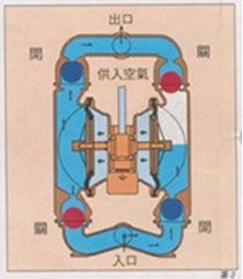 圖1:空氣經(jīng)由氣閥壓縮進入膜片A之背面,由膜片擠壓液室。此種以空氣驅(qū)動的方式可免除一般活塞驅(qū)動之機械應(yīng)力,從而顯著地延長膜片的壽命。在壓縮空氣將膜片A推離中心體時,另一端之膜片B同時被連結(jié)之中心軸拉向中心體,此時,膜片B背面之空氣由出口排放到泵體外。如此使B室形成真空狀態(tài),因而能靠外面大氣壓力之作用將流體由入口支管將閥球推離閥座使流體能自由地進入B室直至填滿。