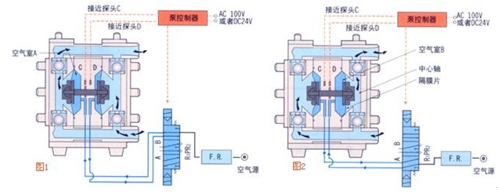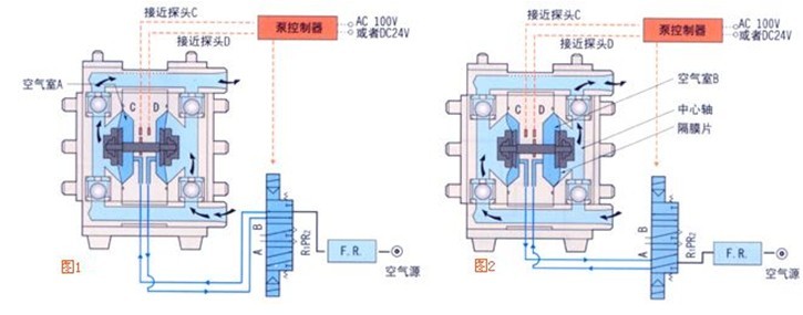 ②中心軸向左移動到行程盡頭時,被接近開關(guān)C感知,使泵的電氣控制原件動作控制電磁閥換向。(圖1) ③電磁閥換向以后.壓縮空氣被送入空氣室B,中心軸和膜片又同時向右方向移動。(圖2) ④中心軸向右移動到行程盡頭時,被接近開關(guān)D感知,使泵的電氣控制原件動作控制電磁閥換向回到圖1的狀態(tài)。 以上動作往復(fù)進行,使隔膜泵連續(xù)動作下去。 (注)除了使用專用泵的電氣控制原件外,也可使用P.L.C進行控制。 ![]() |
